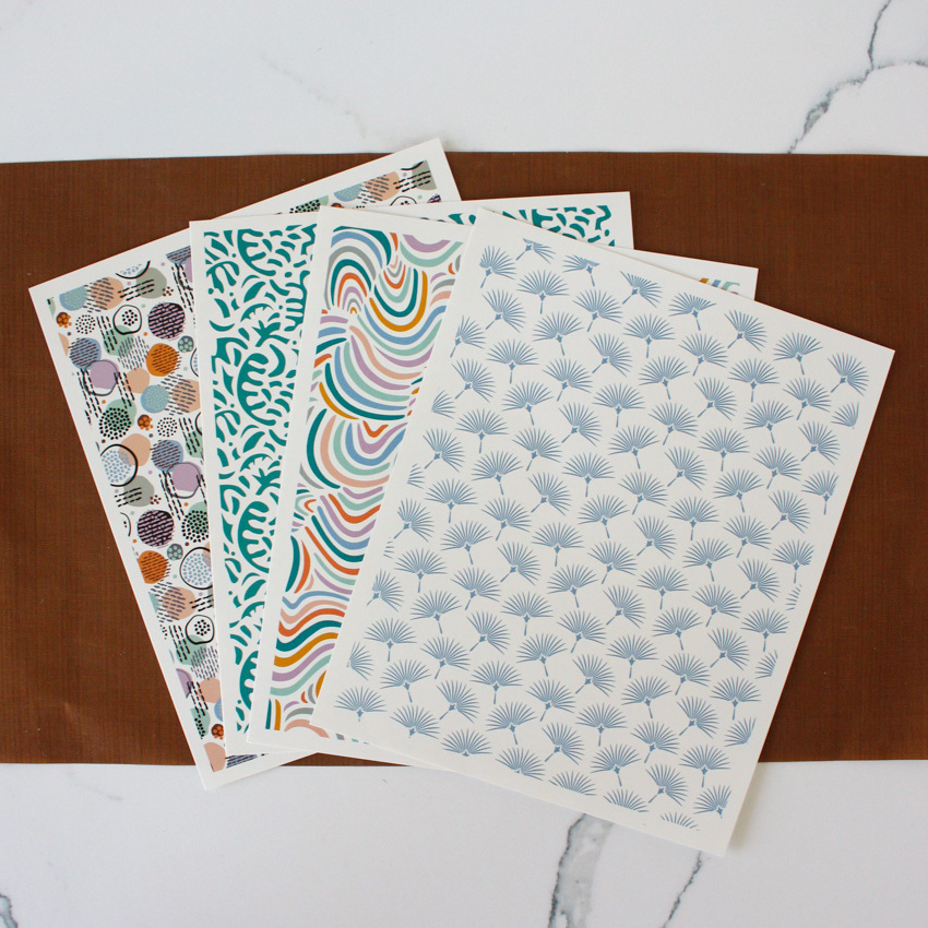 What makes these transfers so great is how simple they are to use. They come in a wide variety of patterns, making them perfect for quick, creative projects. For these mirrors, I used the Geometric pack, which includes four unique designs: Scribbles, Swirls, Dots, and Deco Fans. Each sheet measures 6.75 inches high by 5.5 inches wide—just the right size for small-scale creations like these mirrors. Of course, the possibilities don’t stop there. These transfers would also be perfect for customizing jewelry, keychains, picture frames, and more!