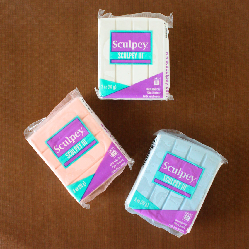 Sculpey Clay (I used Sculpey III in the colors peach, sky blue, and white)