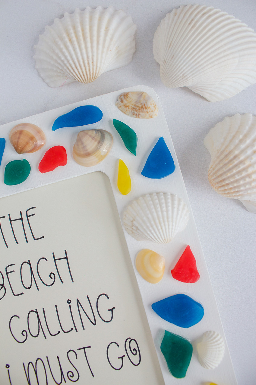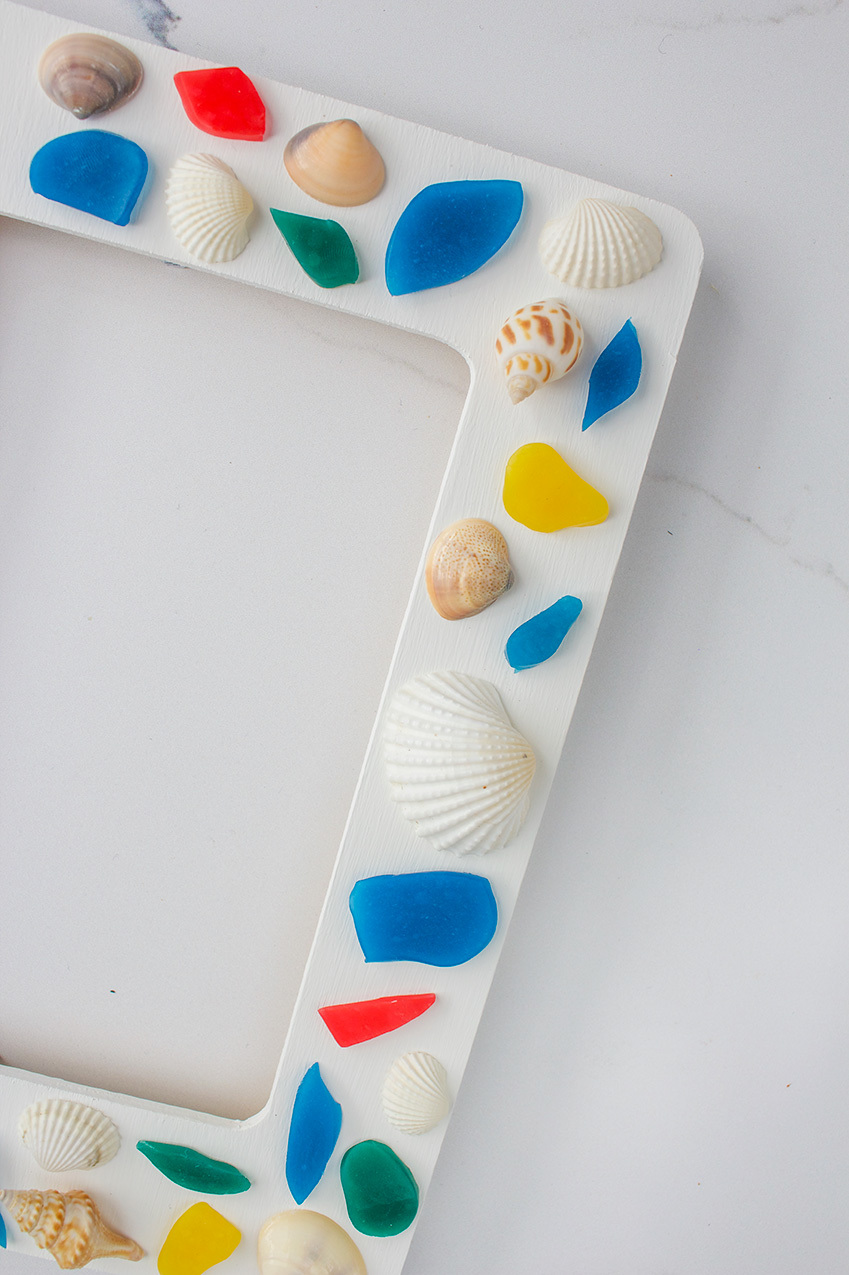 Step 4) Glue your seashells and faux sea glass pieces onto your frame like a mosaic.