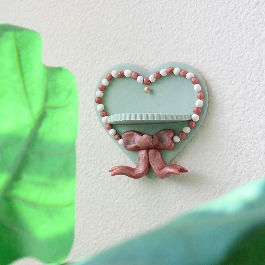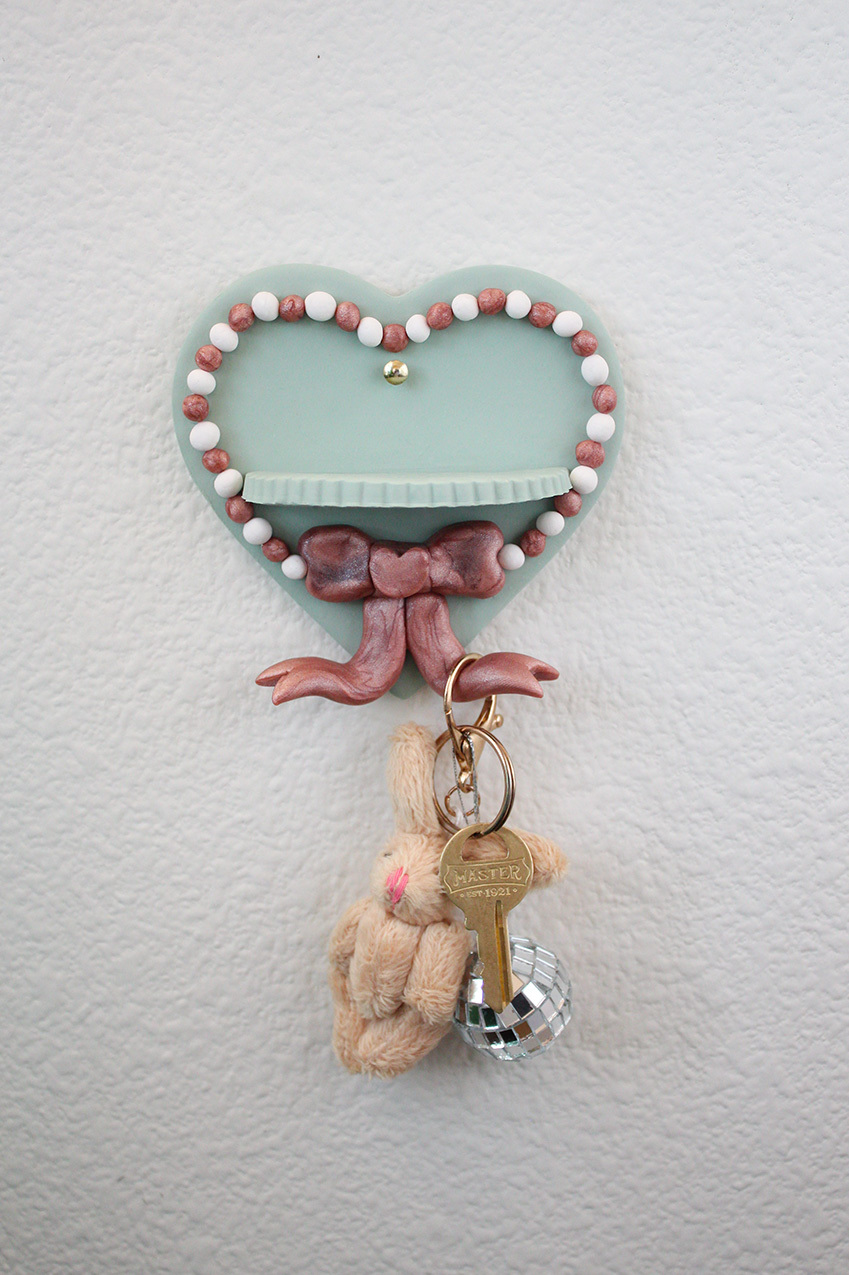 This project is relatively simple, offering a stylish way to display your favorite trinkets and hang up your keys. As a reminder, Sculpey Premo is incredibly durable, flexible, and non-toxic, plus it doesn't air dry! Personally, I'm smitten with that elegant metallic bow, but honestly, I love how this entire piece turned out.